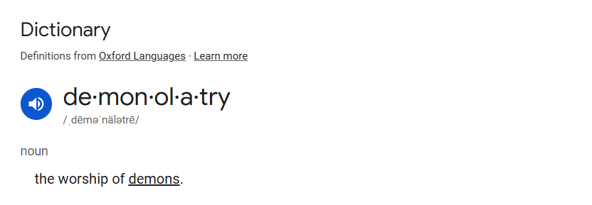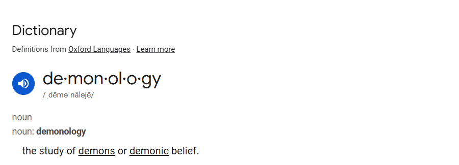 Demonology is the STUDY of demons & Witchcraft. it is NOT the worship of them. that would be demonolatry. Which I will show the actual definition of both words. (Because I say this and people say, “that’s not a thing!”)